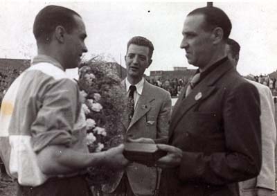 HOMENATGE I COMIAT DE GRÀCIA. 6 DE SETEMBRE DE 1942. A LA PRIMERA FOTO, HI VEIEM EL BATLLE SR. JOSEP MA. MARCET, ENTREGANT-LI UNA PLACA COMMEMORATIVA A EN GRÀCIA. A LA FOTOGRAFIA INFERIOR, L'ALINEACIÓ DEL PARTIT, HI PODEM VEURE-HI A: BARDINA, RUBIES, GRÀCIA, CANO, PATRO, "FIFO" NAVARRO, SERGIO, PRAT, SOLER, PARAREDA, PUEYO, PUJOL I SASOT. FOTOGRAFIES DE JOAN BARBERAN. GRÀCIES JOAN! |