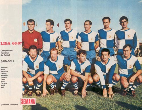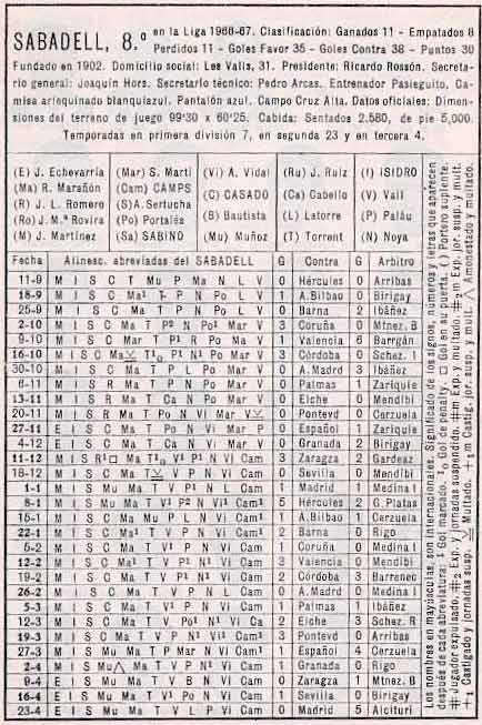 | El Centre d'Esports Sabadell es comença a situar entre els primers classificats. Una meritòria vuitena posició del conjunt arlequinat afirma l'equip a la màxima categoria estatal. Aquest any es donava l'adéu a un estadi quasi bé llegendari que se'ns havia quedat petit: la Creu Alta. Seria l'última temporada a l'estadi que va viure seixanta anys de futbol i emocions, tant bones com dolentes, des del ja llunyana inauguració del 3 de Juny de 1.906. L'últim partit oficial seria un C.E. Sabadell - Sevilla, F.C. el dia 15 d'abril de 1.967 amb resultat final de 1 - 0, victòria arlequinada, tot i que posteriorment es varen jugar dues eliminatòries de Copa contra la Real Sociedad i Granada. L'última temporada a la Creu Alta també podrà ser recordada per l'autèntic fortí que va suposar aquell Estadi: deu victòries, quatre empats i una única derrota, va ser l'arma amb la qual millor va lluitar en aquella temporada l'equip sabadellenc. Campió de Lliga el Real Madrid amb quaranta-set punts. Baixaren a Segona Divisió el Deportivo de la Coruña, amb divuit punts, l'Hércules d'Alacant amb vint i després de fer una promoció, el Granada, C. F., curiosament els tres equips ascendits d'any anterior. Van ascendir Real Sociedad de Sant Sebastià i C. D. Málaga juntament amb el Real Betis Balompié que li va guanyar la promoció al Granada, C. F. (2-1/1-0). El Sevilla, F. C. que va mantenir la categoria després de guanyar l'altre promoció contra l'Spórting de Gijón (1-0/1-0). |