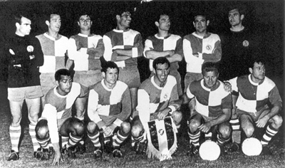 PARTIT AMISTOS PER CEL.LEBRAR LA PERMANENCIA A PRIMERA DE LA TEMPORADA ANTERIOR, JUGAT EL DIA 11/6/1966 CONTRA EL VASCO DE GAMA BRASILER. EL RESULTAT FINAL VA SER 3 A 1 A FAVOR DEL C.E.S. A L'ONZE ARLEQUINAT S'HI POT VEURE A EN KUBALA!! (A BAIX, EL SEGON PER LA DRETA) DURANT LA CEL.LEBRACIÓ DEL PARTIT, ES VA ENTREGAR LA MEDALLA D'OR DE LA CIUTAT AL ALESHORES PRESIDENT, SR. RICARDO ROSSÓN |