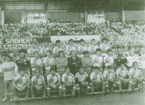 El 6 de agosto de 1985, con Rafael Arroyos como presidente y Pedro María Uribarri como técnico, efectuaba su presentación oficial la que conseguiría el preciado ascenso a Primera División. Lo componía, Capó, Sauras, Brasi, Costa, Ordoqui, Alonso, Palanca, Nacho, Peters, Lino, Merayo, Fernández, Sánchez, Sala, César, Serrat, Zunzunegui, Villa y Ribes. Les envío esta fotografía para seguir completando la historia centenaria de nuestro C.E.Sabadell F.C. Saludos, Labtec. |