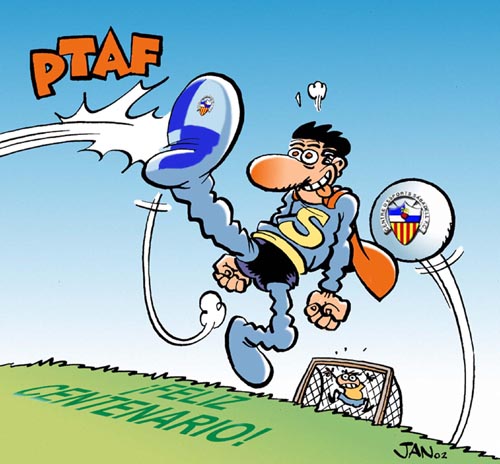 | "ENHORABONA PER EIXOS 100 ANYS!! JO TAMBE VULL UNIR-ME A AQUESTA CELEBRACIÓ, PERÒ PRIMER PRESENTARME: SOC UN ALICANTÍ DE 17 ANYS, QUE EN ACABAR EL BATXILLERAT ANIRÉ A FER BELLES ARTS, I DIBUIXE CÓMICS I VOLÍA DONAR-VOS EL MEU DIBUIX. EM DIC ULISES PONCE LOPEZ I SIGNE U.P.L. ALS CÓMICS. DE NOU, FELICITACIONS I ÀNIMS. UN ABRAÇ, ULISES P.L. (ALACANT)" |