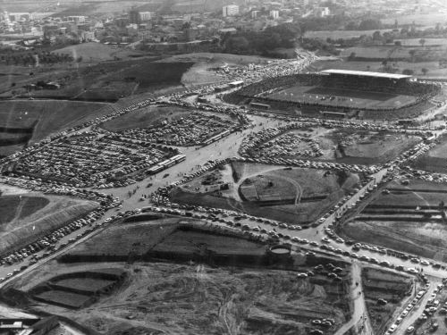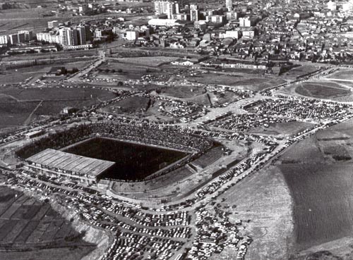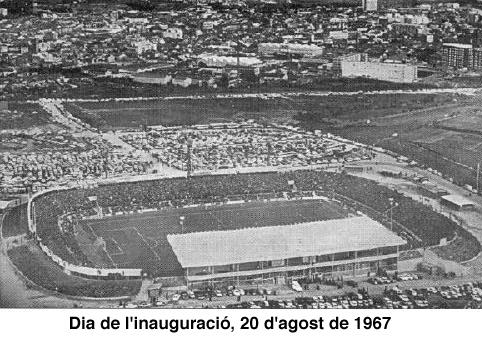 S'inicien les obres de construcció el 15 de setembre de 1966 en els antics terrenys de "Can Borgonyo". El 30 d'octubre ja s'havien mogut 90.000 mts cúbics de terra, un 40% d'aquesta terra es varen aprofitar per construir les pendents de la grada. En 45 dies, el camp ja tenia dibuixada la seva fisonomia El formigó es feia al centre del camp, amb una producció de 100 mts cúbics per jornada. Sota la direcció del Sr. Gabriel Bracons (arquitecte) i del Sr. Argemí (constructor) es varen construir: 1.800 mts de baranes i 400 mts d'escales. També van ser necessaries 5.500 mts cúbics d'àrids (sorra) pel formigó, 2.000.000 de kilos de ciment "Porland" i 40.000 kilos de barres de ferro pel formigó armat. Les dimensions de la tribuna son: 2.000 metres quadrats de superficie coberta i per a la construcció del sostre es varen fer servir 70.000 kg. El 2 de juny es va començar a omplir el camp... la base està composta per 1.800 mts cúbics de pedra trinxada de diferents mides, la següent capa consta de 2.000 mts cúbics de sorra especial i 7.500 mts quadrats d'herva que es comença a plantar el 19 de juny de 1967 i s'acava 2 setmanes després i per finalitzar, es van fer servir 60.000 litres d'aigua per regar L'últim partit a la "vella" creu alta fou en motiu de l'eliminatòria de la copa del "Generalísimo" contra el Granada i va acabar en empat a 1 gol. La "vella" Creu Alta es retirava anticipadament després de 67 anys. El 20 d'Agost de 1967 es va inaugurar l'estadi amb la sacada d'honor a càrrec del llavors "Delegado Nacional de Educación Física y Deportes", Sr. Joan Antoni Samaranch i altres personalitats de l'època. Logicament, també varen fer possible aquesta construcció, els 210 obrers amb els seus 265 dies de treball |