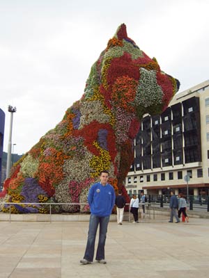 L'AMIC ADRIAN AMB PUPI, EL GOS GEGANT QUE ESTA A PORTA DEL MUSEU GUGHENHEIM. COM ES POT VEURE, EL PUPI ESTÀ RECOBERT DE PLANTES QUE CANVIEN DE COLOR DEPENEN DE L'ESTACIÓ DE L'ANY. |