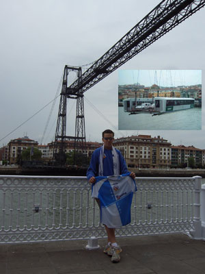 que travesa tot Bilbao i va a parar al Mar Cantàbric a aquesta localitat de Getxo, al darrere, i amb el "Puente Colgante" al fons. Aquest pont te la peculiaritat de que esta "sujetado" només per cordes, a més de ser el pont transbordador més antic del món. Pots travesar el riu en un trasbordador que te unes cabines per a persones, i un espai per cotxes, camions, motos... i ho travesses per l'aire, es a dir, penjant (us adjunto un altre foto on es veu aixo). |