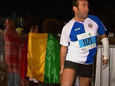 Fotograma del programa "Afers Exteriors", dirigit i presentat pel sabadellenc Miquel Calçada "MikiMoto", on se'l veu vestit d'arlequinat poc abans de començar una marató a Dubai. |