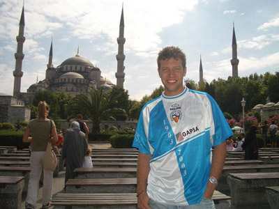 Aprofitant que hi tenia un amic estudiant d'Erasmus, en Gerard es va passejar pels carrers de Lisboa lluint la seva samarreta arlequinada. |