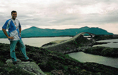 TONI A LA CARRETERA ATLANTICA ("una carretera espectacular construida sobre petites illes i amb molts ponts que alhora serveix de dic") AMB ELS FIORDS AL FONS, NO VA PODER EVITAR FER-SE LA FOTO AMB LA SAMARRETA ARLEQUINADA. EN TONI TAMBE ENS EXPLICA QUE EN EL MATEIX VIATGE ORGANITZAT, ES VA TROBAR UN "ALTRE ARLEQUINAT PEL MON", EN JOSEP SOLEY (VEURE 4 FOTOS MES AVALL) |
