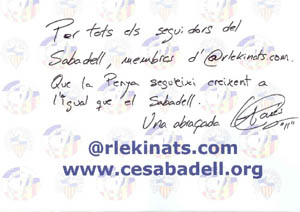Manelinho> WENO ARA COMENCEM EL XAT AMB JORDI TARRÉS oscarjx> Encara que no hagi acabat com valores globalment la temporada, a nivell personal i a nivell d'equip? JorTARRES> Crec que com has dit la temporada encara no ha acabat, i potser les valoracions s'haurien de fer a final de temporada. Jo almenys tinc encara esperances de quedar ben amunt a la classificació. ok > thirus>Prefereixes jugar sol com a davanter o amb un altre? JorTARRÉS> Evidentment m'estimo m s jugar amb algú al costat, així m'hi puc anar recolzant. Ok > caxondo^> Hola Tarrés, cuanto cres q qedaremos sta semana? JorTARRES> Yo aposto per un 2-0. ok > Joanms> Els jugadors seguiu amb interès els actes del centenari? JorTARRES> Sincerament no els estic seguint massa, per vaig estar el dia que van presentar al Corte Inglés la samarreta. Espero que la gent s'hi interessi. ok > JBP> Que en penses de l'afició arlekinada? JorTARRES> La veritat es que m'he sentit molt recolzat amb l'afició. La gent m'anima a que continui defenent els colors del Sabadell i jo es el que intento cada diumenge. ok > Manel> Tens alguna mania a superstició abans d'entrar al terreny de joc? JorTARRES> Moltes, soc molt supersticiós. Algunes de molt especials, però això es molt típic entre els esportistes. Ok > charly^_^> amb ki et sents + còmode jugant en punta, amb cuyami o amb orife? Ki s'adapta + al teu estil de joc?? JorTARRES> Jo jugar amb aquell qui em mani l'entrenador. Tots dos son jugadors professionals com jo, i en el camp ens intentem ajudar mútuament. ok > Eva> El camp et veus in noi serio la vida real et igual? JorTARRES> Jo crec que en el camp si soc molt seriós, per a la vida real la gent que em coneix sap que més aviat casi mai estic seriós .ok > <caxondo^> algun club está interesado en tu fixaje? seguiras con nosotros la temporada q viene?? pero q si JorTARRES> La temporada que viene tengo contrato aquí en el Sabadell. La verdad es que a título personal desconozco el interés de algun club, aunque si el club cree conveniente venderme a algun interesado, ya hablaríamos. ok > Sbd_Pwr> Hola Jordi, un jugador, que prefereix? jugar a un filial o a un equip amb identitat pròpia? JorTARRES> La veritat es que son equips amb filosofies diferents. Un filial forma jugadors, i un equip com el Sabadell és un primer equip. Jo personalment m'estimo més un equip amb una identitat pròpia com tu dius. Aquest és el cas del Sabadell. ok > raul_sbd5> Hola Jordi. Podem somiar l'any ke ve amb una dupla Tarres-Orife? JorTARRES> En nom de l'Orife no puc parlar, per en el meu cas ja he dit que tinc contracte l'any vinent, i esperem complir-lo. ok Sbd_Pwr> Jordi, estàs acostumat a ser el pitxitxi de l'equip? quin rècord de gols tens i on ho vas aconseguir? JorTARRES> El meu rècord son 12 gols a l'Igualada a Primera Catalana. Normalment no acostumo a ser el pitxitxi de l'equip , pq les meves característiques son més aviat d'un segon punta. I aquesta va ser amb la idea de fitxatge amb la que vaig arribar aquí, tot i q les circumstàncies han estat diferents. Tot i això estic molt content, pq a nivell personal està anant força be l'any. ok > raul_sbd5> Hola Jordi!!!! Creus que els tres punts de diumenge ens marcaran els objectius? Hospi 0 - Alacant 4!!!!!!!! JorTARRES> Si. A més a més de tres punts va ser un cop moral per als rivals. Ara em d'aconseguir guanyar a la Gramanet, i llavors mirar i marcar objectius a dalt de la classificació. ok > Sbd_Pwr> Jordi, tens algun ídol a primera divisió? JorTARRES> Si i tant. El millor de tots és el Zidane, sota el meu punt de vista. Però també m'agrada molt el turc Nihat que juga a la Real Sociedad. ok > Sbd_Pwr> Jordi, mulla't... selecció Catalana o espanyola? JorTARRES> Vaig jugar a la sel. catalana sub-17. Tot i que com a professional que soc, m'agradaria jugar a l'espanyola. ok > raul_sbd5> Que creus ke li passa a l'equip quant juga fora de casa? (A casa 30 punts i a fora només 11) JorTARRES> La veritat es q jo tampoc ho sé el q passa. Psicologia?? No ho sé. La veritat es que esperem millorar com a visitants en aquest final de temporada. ok > Sbd_Pwr> Jordi, hi han clàusules de rescisió a 2a B? es cert que el jugador cobra un % d'aquest import? JorTARRES> Depèn del contracte del jugador. Normalment si. I que el jugador s'emporta un % es totalment fals. ok > caxondo^> antes d empzar la tmporada t marcast alguna meta rspecto a los tantos?????? crees q la vas a cumplir????? cuantos llevas??????? JorTARRES> Llevo 11, metas no tengo, pero cuantos mas mejor. Espero que suba la cifra antes de que acabe la temporada. ok > PEIXITU> ke sabies del sabadell abans de venir a jugar aki?? JorTARRES> Sabia que era un gran club, històricament sobretot. Ha estat força anys a Primera, i esperem q algun dia hi torni a ser. ok > charly^_^> ki kreus k guanyara la lliga d 1 divisio??? JorTARRES> El Reial Madrid, es el qui té millor equip. Sens dubte seran els campions. ok > Sbd_Pwr> Jordi, a quina edat un jugador perd la il·lusió de jugar a primera? o es un somni que sempre dura, dura i dura... fins que et retires? JorTARRES> Sempre dura, crec jo. Tots els jugadors quan comencen a jugar creuen en aquest somni, tot i que a mesura q passen els anys es cada cop més difícil. ok > Sbd_Pwr> Jordi, a quin club de primera aniries amb els ulls tancats?? JorTARRES> Sincerament a tots, és la il·lusió de la meva vida jugar a Primera. I si em deixessin escollir aniria al València. Es un equip q em cau simpàtic. ok > Sbd_Pwr> Jordi, sigues crític amb tu mateix... que et milloraries?? JorTARRES> El remat de cap, i el joc de xoc. Això és el q més haig de millorar, tot i q cada entrenament milloro coses. ok > martona> que te parecen esta temporada las cheerleaders? JorTARRES> Muy bien. Aunque mucho tiempo para verlas no tengo pq en la media parte de los domingos tengo q ir corriendo al vestuario. ok > alex> Que pronostico de SBD - GRAMA i NOVELDA - SBD? JorTARRES> SBD-GRAMA 2-0. NOV-SBD 1-2. ok